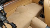 The interior features replacement tan vinyl seat covers and matching replacement carpets. Amenities include a walnut dashboard, a heater, and three-point seatbelts. The center console has the factory cutouts for a two-knob radio.