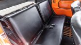 The cabin features seats trimmed in black vinyl with a matching dashboard and carpets protected by slatted wood floorboards. Latch-and-link lap belts are installed for all occupants, and a Pioneer CD stereo is wired to speakers behind the rear seats and in the front kick panels.