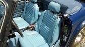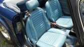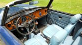 The interior features bucket seats trimmed in light blue upholstery, and the matching carpeting is protected by rubber liners. Other equipment includes an AM/FM stereo, TR6-branded shift knob, and locking glove box.