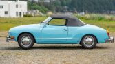 This 1974 Volkswagen Karmann Ghia convertible is a final-year example that was sold new by Solano Volkswagen of Vacaville, California, and purchased by the seller in 2010, reportedly from the second owner. The car is finished in Olympic Blue over a black interior and is powered by a 1.6-liter flat-four paired with a four-speed manual transaxle. Equipment includes a black soft top, high-back bucket seats, chrome bumpers, a VDO tachometer, and a Sapphire AM/FM radio. Work completed in…