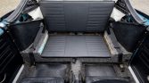 The high-back bucket seats and rear bench seat were reupholstered in black vinyl in 2012 and are joined by a matching dash and salt-and-pepper carpets. Equipment includes shoulder restraints, a Sapphire XIX AM/FM radio, a heater, hand-crank windows, and a locking glove box. The seller notes blank speaker holes in the door panels and cracks in the face of the dash, which can be seen in the gallery. The throttle pedal assembly was overhauled in February 2021.