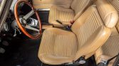 The seats and door panels are upholstered in beige vinyl while woodgrain trim accents the dashboard. Amenities include an under-dash air conditioner, a Blaupunkt AM radio, a Veglia analog clock, and three-point seatbelts.