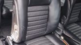 The cabin features black vinyl upholstery with charcoal carpeting and wood trim on the dashboard and door panels. Equipment includes German-language controls, a period AM/FM radio, power windows, and front bucket seats.