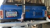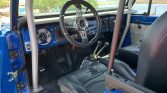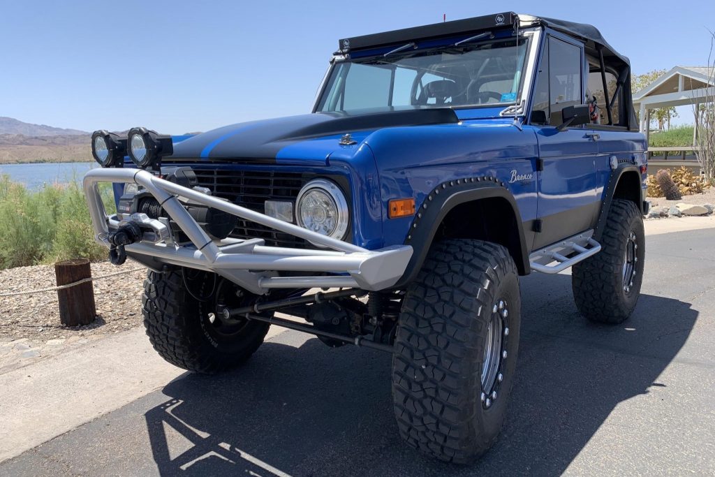 This 1975 Ford Bronco is supplied by a 302ci V8 crate engine equipped with FiTech fuel injection, an Edelbrock intake manifold, aluminum cylinder heads, roller rockers, and an aftermarket exhaust system. Shifting is through a three-speed automatic transmission fitted with a custom billet torque converter, and additional equipment includes a twin-stick two-speed transfer case, High Lifter driveshafts, ARB front and rear locking differentials, a James Duff lift kit, Bilstein shocks, aftermarket 17″ beadlock wheels with 37″ tires, hydraulically-assisted four-wheel disc brakes, a winch, a roll cage, and aftermarket bumpers and rock sliders. The truck has been repainted blue with black stripes and fitted with an aftermarket cowl hood and wheel arch flares, while the interior features aftermarket bucket seats, Crow Enterprizes harnesses, and an aftermarket sound system.