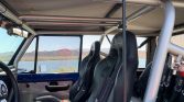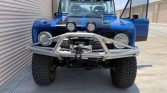 The body was refinished in blue with black stripes and lower body panels in 2014, and an aftermarket cowl hood was installed at that time. LineX protective coating is said to have been applied to the floors, and aftermarket HID exterior lighting, powder coated bumpers, and James Duff rock sliders have been added. Additional features include a black soft top, a roll cage, a Warn winch, a Baja Design light bar, black wheel arch flares, a rear hitch, and a swing-out spare carrier with a hi-lift jack mount.