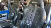 The front bucket seats are trimmed in black and feature embroidered Bronco script on the headrests as well as Crow Enterprizes harnesses. Matching upholstery extends to the rear seats, and the doors are fitted with stainless steel panels. Modifications include a full roll cage, a Grant steering wheel, a billet shifter plate and seatbelt anchors, two fire extinguishers, and an Alpine stereo linked to aftermarket speakers.
