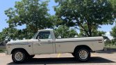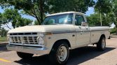 This 1975 Ford F-250 Ranger is a standard-cab pickup that is finished in white over gray cloth and vinyl and is powered by a 390ci V8 paired with a three-speed automatic transmission. Equipment includes 16″ painted steel wheels, towing mirrors, an aftermarket JBL stereo, chrome trim, a tonneau cover, and a Dana 60 rear axle.