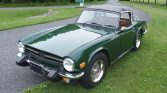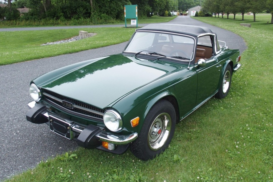 This 1975 Triumph TR6 is a green-over-tan convertible powered by a 2.5-liter inline-six mated to a four-speed manual transmission. Features include a black convertible top, a chrome luggage rack, dual Stromberg carburetors, and a Kenwood cassette stereo. The car spent time in North Carolina prior to its relocation to Pennsylvania and subsequent refurbishment between 1991 and 1992, and it was acquired by its current owner from their father in 2012. Services performed since 2013 are said to include replacement of the front brake calipers, clutch slave cylinder, alternator, and brake light switch.