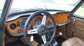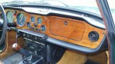 The three-spoke steering wheel with a Triumph horn button frames Smiths instrumentation consisting of a 140-mph speedometer and a tachometer, while additional gauges displaying fuel level, coolant temperature, oil pressure, and battery voltage are housed within the dashboard. The five-digit odometer is believed to have been reset during the refurbishment and currently shows under 8k miles, with total mileage unknown.