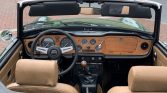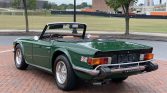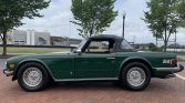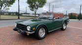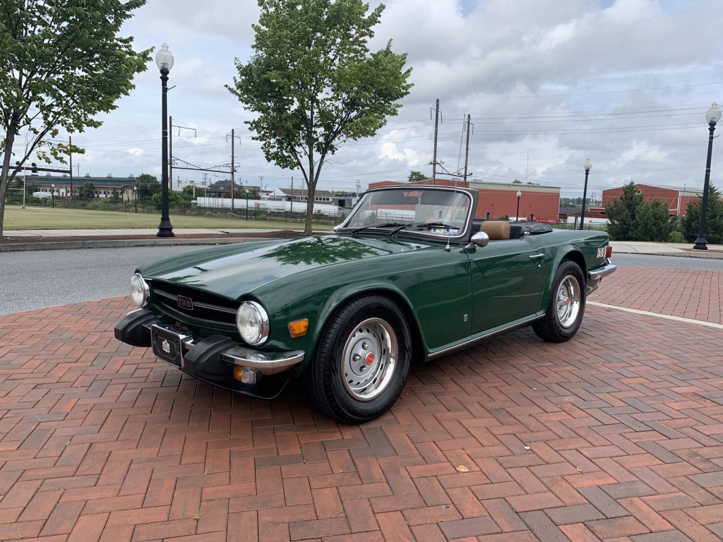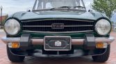 This 1975 Triumph TR6 is finished in green over a beige interior and is powered by a 2.5-liter inline-six equipped with dual Zenith-Stromberg carburetors paired with a four-speed manual transmission with overdrive. Additional equipment includes a black soft top, front spoiler, bullet-style mirrors, chrome bumpers with a rear override bar, and a Clarion AM/FM cassette stereo.