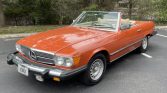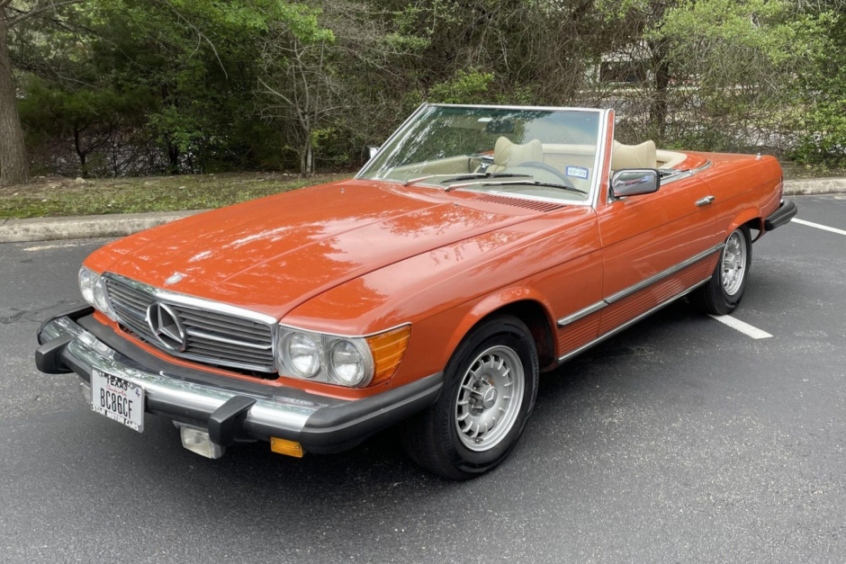 This 1976 Mercedes-Benz 450SL is finished in English Red over beige leather and is powered by a 4.5-liter V8 paired with a three-speed automatic transmission. Equipment includes a body-color removable hardtop, a black soft top, fog lights, cruise control, and air conditioning. The car was acquired by the seller in January 2019, and service in preparation for the sale included replacing the ignition cable and the distributor cap and rotor. This 450SL shows 97k miles and is now offered with a car cover and a clean Texas title in the seller’s name.