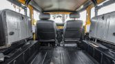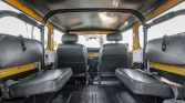 The cabin features front bucket seats upholstered in replacement black cloth with patterned inserts. The floor is coated in bedliner, and equipment includes black door panel inserts, rear inward-facing jump seats, a fire extinguisher, and an Alpine cassette stereo linked to rear-mounted speakers.