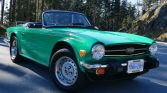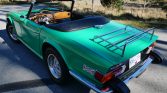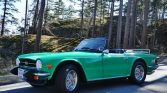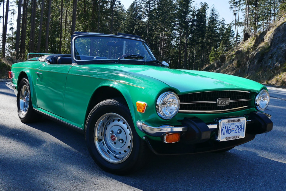 This Triumph TR6 was manufactured in July of 1976 and is finished in Java Green over black vinyl upholstery. Power comes from a 2.5-liter inline-six paired with a four-speed manual transmission, and equipment includes a black soft top, twin Zenith-Stromberg carburetors, a front air dam, chrome bumpers with overriders, a Nardi wood-rimmed steering wheel, and a Retrosound multimedia stereo system.