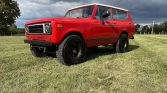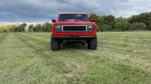 This 1977 International Harvester Scout II is finished in red with black accents over tan leather upholstery and is powered by a 345ci V8 paired with a three-speed automatic transmission and a two-speed transfer case. Features include a removable hardtop, LED headlamps, 15″ steel wheels, a 2.5″ suspension lift, 33″ tires, Skyjacker shocks, power-assisted four-wheel disc brakes, a custom diamond-stitched interior, and a Pioneer Bluetooth/USB stereo. The truck was refurbished under previous ownership and was acquired by…