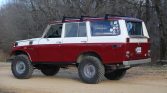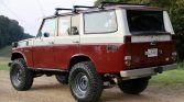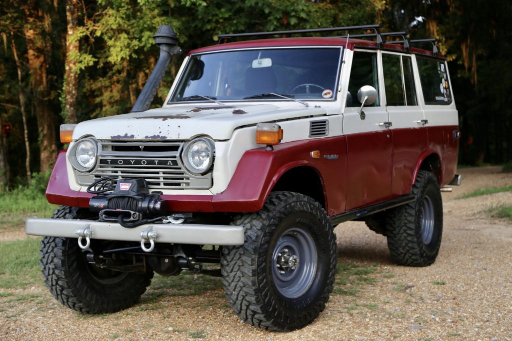 This 1977 Toyota Land Cruiser FJ55 was acquired by the seller in 2016 after having been abandoned at a Mississippi body shop for approximately 12 years. Modifications performed under current ownership include installation of a Mosley Motors 4.4-liter Toyota 2F inline-six, a Toyota H55 five-speed manual transmission, Holley Sniper electronic fuel injection, Old Man Emu and Dobinsons suspension components, a drag link and steering rods from an FJ60, a Long Range Automotive 55-gallon fuel cell with RobbMc PowerSurge fuel pump, a 70-series snorkel, a Warn VR8000 winch, FrontRunner load bars, Summit Racing Smooth Vintique wheels, and a rebuild of the rear driveshaft, front axle, and Valley Hybrids split transfer case. The truck is finished in red and white, and the interior has been refurbished with Corbeau front bucket seats, a reupholstered rear bench seat, a RetroSound stereo, and Noico and Lizard Skin insulation.