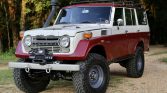 The truck is finished in two-tone red and white and shows signs of fading and paint chips on the hood and rear door, and dents can bee seen around the vehicle. Equipment includes FrontRunner load bars, steel bumpers, a Warn VR8000 winch, a 70-series snorkel, bright-finished sideview mirrors and door handles, front tow hooks, fender vents, steel bumpers, an electric rear window, and a removable pintle hitch. The doors were transferred from a 1973 FJ55 with rebuilt door rubber and hinges.