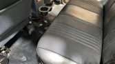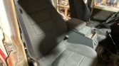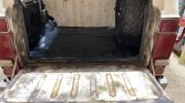 The interior underwent refurbishment under current ownership beginning with Lizard Skin spray-on noise and heat insulation covered with a layer of Noico sound-deadening material. The front seats were replaced with Corbeau buckets, the rear bench was re-covered with gray upholstery, and a RetroSound stereo was installed. Additional features include rubber floor mats, a locking center console, a fire extinguisher, and manual windows.