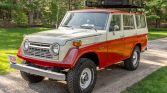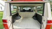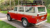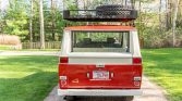The body is said to have been repainted in its factory colors of Freeborn Red and white under previous ownership. Exterior features include a silver-painted front bumper, a white-painted rear bumper, front and rear fender vents, dual chrome side mirrors, a wood-slat Con-Ferr roof rack, and a drop-down tailgate with a power-operated window.