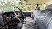 Slotted 15″ steel wheels are painted white and equipped with manually locking front hubs, chrome hubcaps, and BFGoodrich All-Terrain T/A KO2 tires showing 2016 date codes. Nitrocharger Sport shocks and a steering damper from Old Man Emu were fitted under previous ownership, as were rear disc brakes in place of the factory drums.