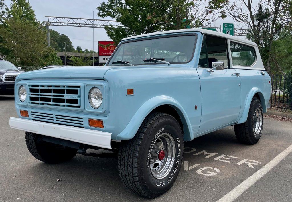 This 1978 International Harvester Scout II was acquired by the seller in June 2021 following a refurbishment in 2020 that reportedly included a repaint in blue and refreshing the cabin. Power comes from a 345ci V8 paired with a three-speed automatic transmission and dual-range transfer case, and equipment includes a white removable hardtop, chromed 15″ wheels, manually locking front hubs, power-assisted front disc brakes, an aftermarket center console, a heater, and a push-button radio.
