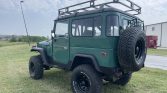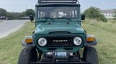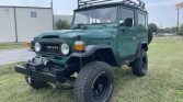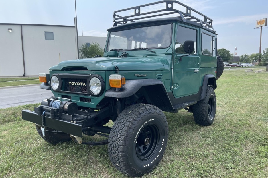 This 1978 Toyota Land Cruiser is powered by a 350ci Chevrolet V8 paired with a four-speed manual transmission and a two-speed transfer case. Finished in green over black vinyl, the truck is equipped with a winch, manually locking front hubs, lifted suspension, 15″ Black Rock alloy wheels with 33″ tires, power-assisted steering and front disc brakes, a roof basket and ladder, a roll cage, and replacement front bucket seats and a folding rear seat.