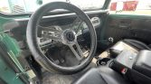The cabin features replacement front bucket seats upholstered in black vinyl. Additional equipment includes a Grant steering wheel wearing a slip-on cover, front shoulder belts, a locking center console with cup holders, a folding rear seat, and a roll cage.