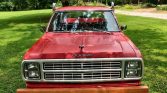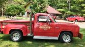 The Li’l Red Express was based on the Dodge D150 pickup with the Utiline stepside bed, and 5,118 examples were produced for the 1979 model year. The model features stacked quad headlights, a flatter hood, and a revised grille, and is finished in Medium Canyon Red (PY3450) with an oak-trimmed bed, chrome bumpers, vertical exhaust stacks, and gold pinstripes and graphics. Additional equipment includes a hitch receiver, a wood front bumper, and silver running boards.