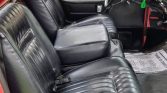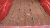 The cab features bucket seats upholstered in black vinyl joined with a matching dashboard and door panels with wood accents. Amenities include a Sanyo AM/FM/cassette stereo, manual windows and door locks, and tilt-out vent windows. The driver’s seat has a tear that has been patched with black tape, and a fire extinguisher is mounted under the driver’s seat.
