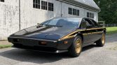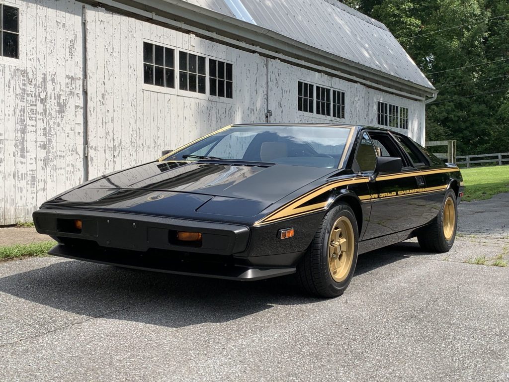 This 1979 Lotus Esprit S2 is #47 of 55 North American-market World Championship Commemorative Edition models built and was sold new from LaMonsa Motors in Mahwah, New Jersey. It is said to have remained with a friend of the seller for 28 years before being purchased by the seller in 2013. The car is finished in black and gold over a matching interior and is powered by a 2.0-liter inline-four paired with a five-speed manual transaxle. The Commemorative Edition included unique badging, gold Speedline wheels, and a leather-wrapped steering wheel. The car was displayed at the AACA Museum as part of their “Lotus: The Art of Lightness” exhibit in 2015.