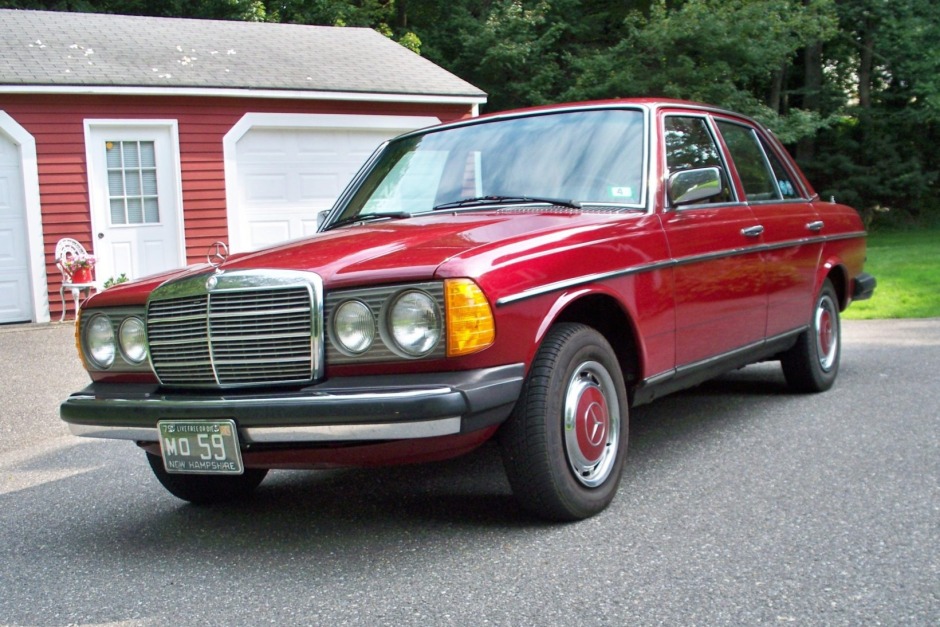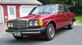 This 1979 Mercedes-Benz 240D is finished in Medium Red over a tan MB-Tex interior and was acquired by the seller in 2017, reportedly from the family of the original owner. Power is provided by a 2.4-liter diesel inline-four paired with a four-speed manual transmission, and additional equipment includes air conditioning, a Volkswagen-branded AM/FM cassette stereo, wood interior trim, a heated rear window, and 14″ wheels with body-color wheel covers.