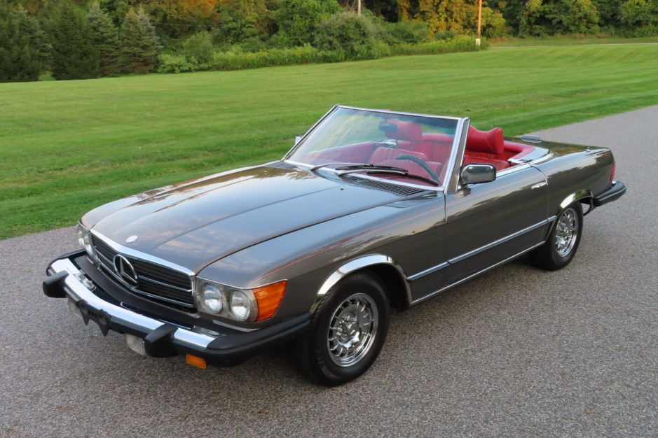 This 1979 Mercedes-Benz 450SL is finished in Anthracite Gray Metallic over red leather and is powered by a 4.5-liter V8 paired with a three-speed automatic transmission. This R107 shows 84k miles and is offered at no reserve with a removable hardtop and manufacturer’s literature.