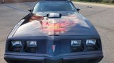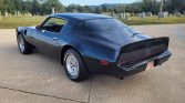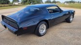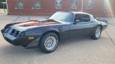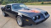 This 1979 Pontiac Firebird Trans has been refinished in Starlight Black over black vinyl and is powered by a 301ci V8 linked with a three-speed automatic transmission and a Safe-T-Track limited-slip differential. Equipment includes a shaker hood, 15″ snowflake alloy wheels, front disc brakes, power steering, air conditioning, and a Kenwood Bluetooth stereo.