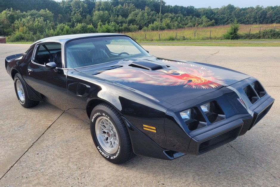 Finished from the factory in Starlight Black, the car is said to have been repainted and fitted with a replacement Firebird graphic on the shaker hood under previous ownership. Additional details include front and rear spoilers, painted mirror caps, and dual exhaust outlets.