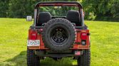 Black 15″ wheels are wrapped in 32×11.5” Goodyear Wrangler MT/R tires that show date codes from 2016, and a matching spare is mounted to the swing-away rear tire carrier. Rancho shocks are fitted at all four corners.