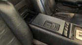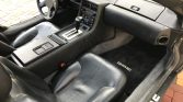 The cabin features black leather upholstery with a matching dashboard, center console, and door panels along with gray carpets. Equipment includes air conditioning, a cassette stereo, power windows, and DMC-branded floor mats. Modifications include a stainless-steel shifter plate and sill plate letters, Sony speakers, a Lockzilla keyless entry system, an Alcantara headliner, and a spare storage compartment door with a “flux capacitor”-style face.