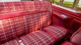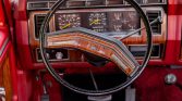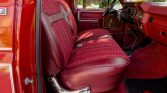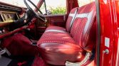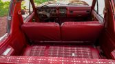 The front bench seat is upholstered in red cloth with patterned inserts and is joined by a matching dashboard, carpets, and door panels. The dashboard and door panels feature woodgrain trim specific to the XLT package. Additional amenities include cruise control, a rear window defroster, and a factory AM/FM/8-Track stereo.