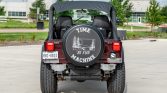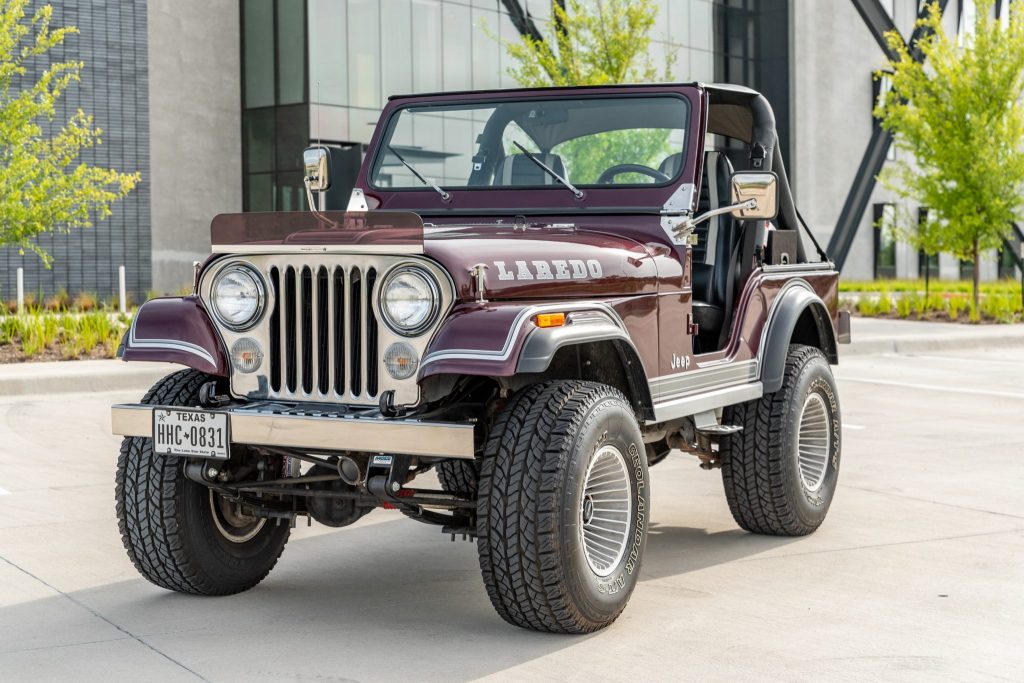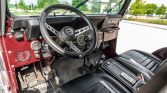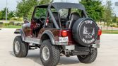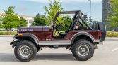 This 1981 Jeep CJ-5 was reportedly acquired by the seller from the original owner in 2009, and a subsequent refurbishment involved a repaint in dark red metallic, a reupholstered black interior, and the installation of a replacement 304ci V8 which is mated to a three-speed manual transmission and a dual-range transfer case. Equipment includes a Surrey top, removable doors, an aftermarket stereo, a lift kit, and 15″ alloy wheels with 33″ tires.