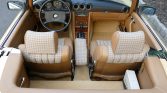 Tan upholstery with patterned cloth inserts covers the seats and center armrest, and refurbished burl walnut veneer trim accents the dashboard, center stack, and console. Amenities include power windows, a Becker radio, and air conditioning. The seller states that the climate control panel was rebuilt and the floor mats have been replaced.