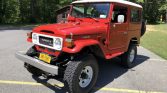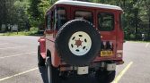 This 1982 Toyota Land Cruiser BJ42 is a left-hand-drive example that was imported into the US in the early 1990s from British Columbia, Canada, and has since spent time in Connecticut and New York. The truck is finished in red over gray and is powered by a 3.4-liter diesel inline-four paired with a four-speed manual transmission and a dual-range transfer case. Equipment includes an Aqualu aluminum tub, rear jump seats, locking front hubs, a cabin heater, a Tuffy center console, an aftermarket Pioneer stereo, an HFS 4″ lift, and a receiver hitch.