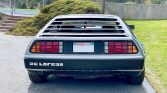 The body features brushed stainless-steel body panels with urethane front and rear fascias mounted on a composite underbody and a Lotus-derived steel chassis. Features include a front spoiler, gullwing doors, rear window louvers, stainless-steel bumper letters, and dual exhaust outlets. The rear louvers were reportedly refurbished, the front license plate holes were filled, the side marker gaskets, louver buffer strips, and rear “DeLorean” letters were replaced, and the hood hinges and gray front fascia were repainted under current ownership. The seller states that the turn signals, side markers, taillights, and brake lights have been replaced with LED units.