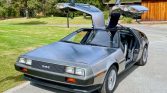 This 1983 DeLorean DMC-12 features brushed stainless-steel bodywork over black leather upholstery and is powered by a 2.85-liter V6 paired with a five-speed manual transaxle. Equipment includes gullwing doors, a louvered rear window cover, staggered-diameter alloy wheels, air conditioning, and a cassette stereo. Refurbishment work performed in 2021 is reported to have included refinishing the front fascia and rear louvers, replacing the door seals, repairing the wiring, reupholstering the instrument binnacle, and installing a KW coilover suspension…