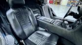 The cabin features black leather upholstery with a matching dashboard, center console, and door panels along with gray carpets. Equipment includes air conditioning, a cassette stereo, power windows, and DMC-branded floor mats. A rear console extension with cupholders was installed in 2021 along with a switch alignment plate, an LED climate control panel, dummy switches in the armrest panel, a replacement dead pedal, and replacement window, defrost, turn signal, and wiper switches. The carpets, door seals, passenger knee pad, left door pull-strap cover, and visor covers were reportedly replaced at DeLorean Motor Company of Huntington Beach, California under current ownership, and a seat stud and the left door escutcheon were repaired.