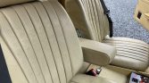 The interior features Beige leather (255A) upholstery on the seats with matching door panels, plastics, and carpeting. Wood trim extends from the center stack to the dashboard, and amenities include automatic climate control, a folding armrest, rear seats with seat belts, Mercedes-branded floor mats, and a Blaupunkt cassette stereo.