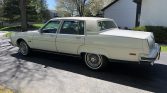 The car is finished in white with a white padded vinyl roof, and details include front cornering lamps, rear fender skirts, rain deflectors, a heated rear window, and chrome bumpers and trim. The seller notes that paint chips and scratches are visible, there are scuffs in the door jambs, and the antenna does not retract.