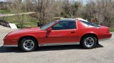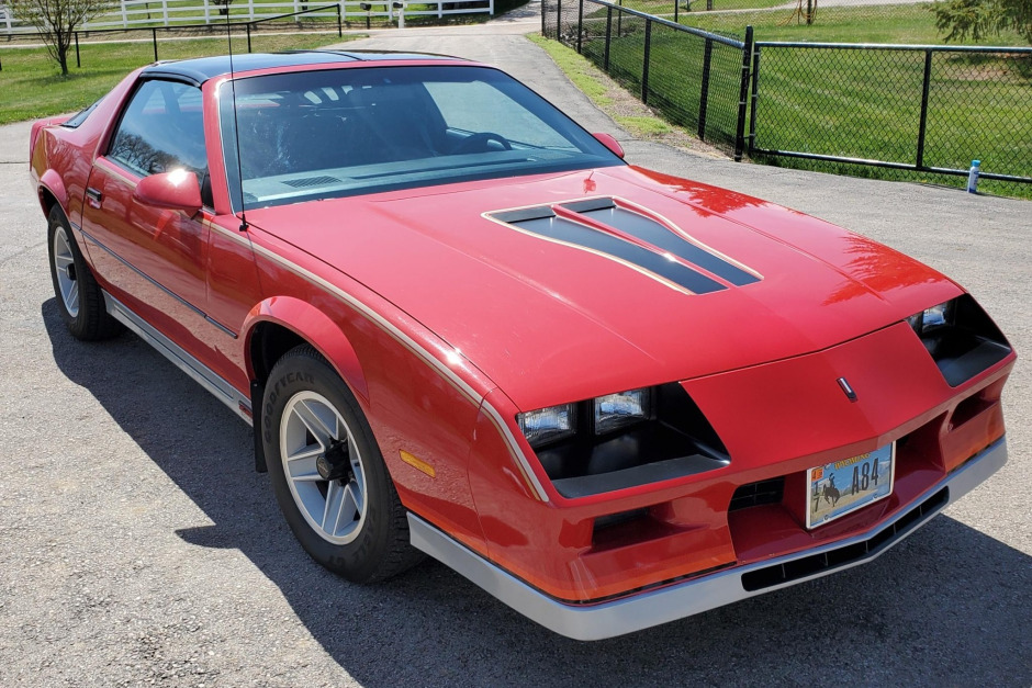 This 1984 Chevrolet Camaro Z28 was sold new at Davis Chevrolet-Cadillac in Gillette, Wyoming, and was acquired by the seller’s grandfather in 1999. The car is finished in red over gray cloth and is powered by a 5.0-liter V8 paired with a four-speed automatic transmission. Features include removable glass T-tops, 15″ alloy wheels, air conditioning, cruise control, power windows and door locks, and a factory cassette stereo with an equalizer.