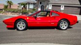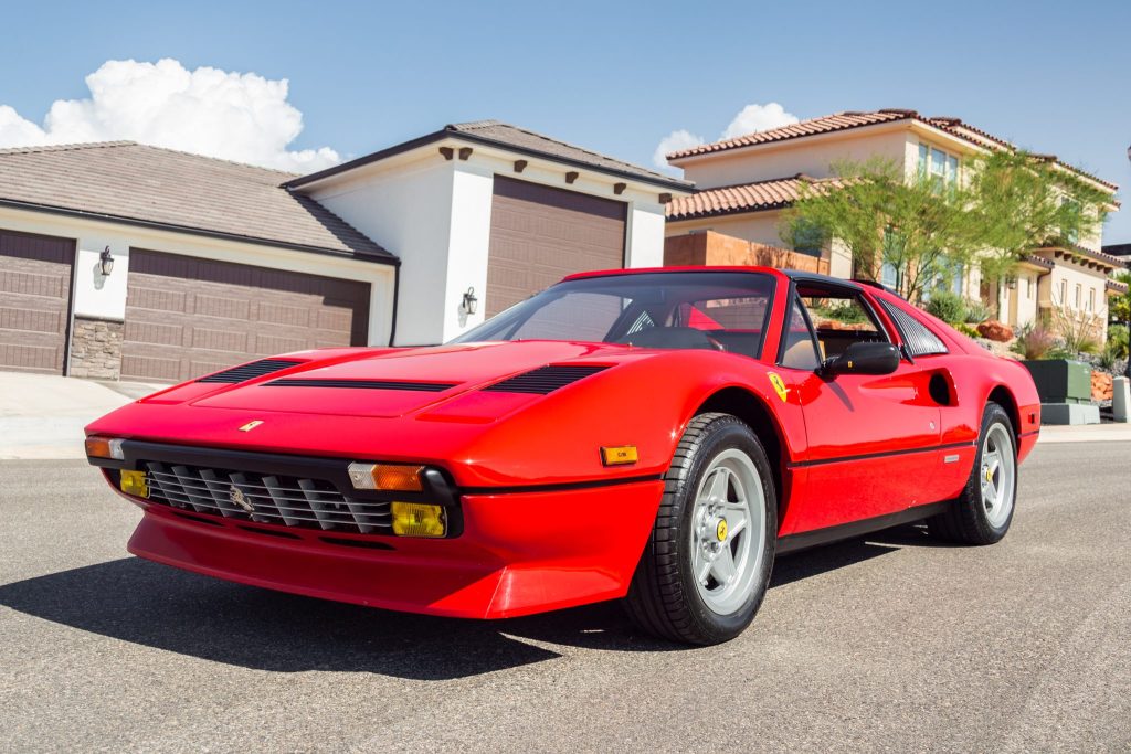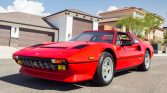 This 1984 Ferrari 308 GTS Quattrovalvole is powered by a fuel-injected 2.9-liter V8 paired with a five-speed manual transaxle and is finished in Rosso Corsa over tan leather with black piping. Equipment includes 16″ Campagnolo alloy wheels, a removable roof panel, a Pioneer head unit, air conditioning, and a wood-rimmed Luisi steering wheel.