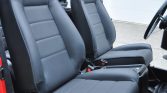 The interior is fitted with replacement front and rear seats upholstered in black vinyl along with floors coated in POR-15 protective paint. Amenities include a Pioneer Bluetooth stereo with a four-channel amplifier, Kenwood speakers, fitted rubber floor mats, and a padded rollbar.