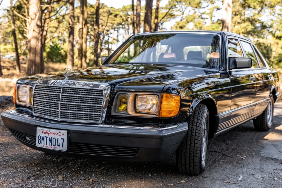 This 1984 Mercedes-Benz 500SEL is powered by a 5.0-liter M117 V8 paired with a four-speed automatic transmission and is finished in black over Palomino leather upholstery. Features include a sunroof, power-adjustable front seats, heated front and rear seats, automatic climate control, cruise control, and a Pioneer AM/FM CD stereo.