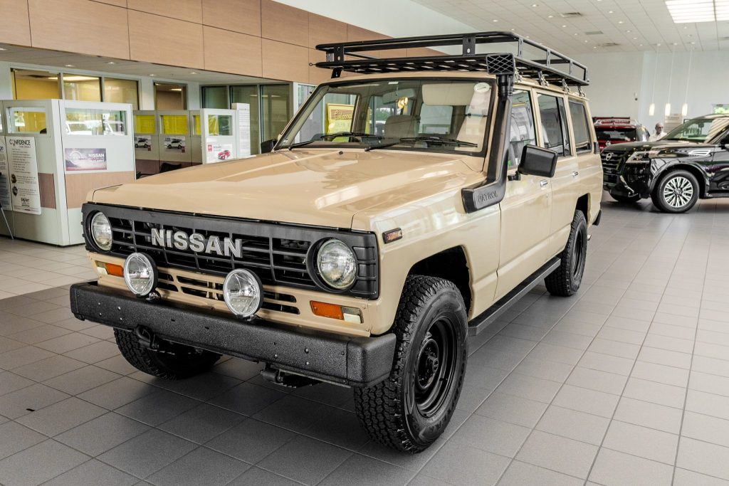 This 1984 Nissan Patrol wagon is a right-hand-drive 4×4 example that is said to have been imported to the US from South Africa during previous ownership and was acquired in 2018 by the seller. The truck is finished in beige over grey upholstery, and power is provided by a 2.8-liter inline-six paired with a four-speed manual transmission and a dual-range transfer case. Equipment includes an Old Man Emu stabilizer bar and shock absorbers, a third-row bench, a roof rack, an intake snorkel, rock sliders, a dashboard-mounted inclinometer, and air conditioning.