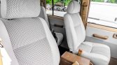 The seating surfaces have been re-covered in light grey vinyl with patterned cloth inserts and matching replacement door panels. The headliner and pedal pads are reported to have also been replaced, and amenities include a third-row bench, air conditioning, an aftermarket CD stereo, aftermarket cupholders, and a dashboard-mounted inclinometer.